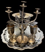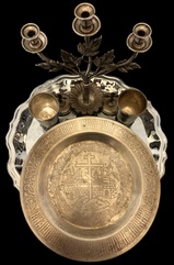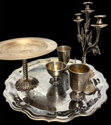 Все предметы за исключением подноса выполнены из медного сплава с глубоким серебрением, подставки скорее всего низкопробное серебро. Поднос из Никиля
