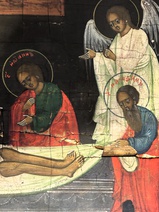 Богоматерь — склоняется над лицом Спасителя, иногда поддерживая его голову.